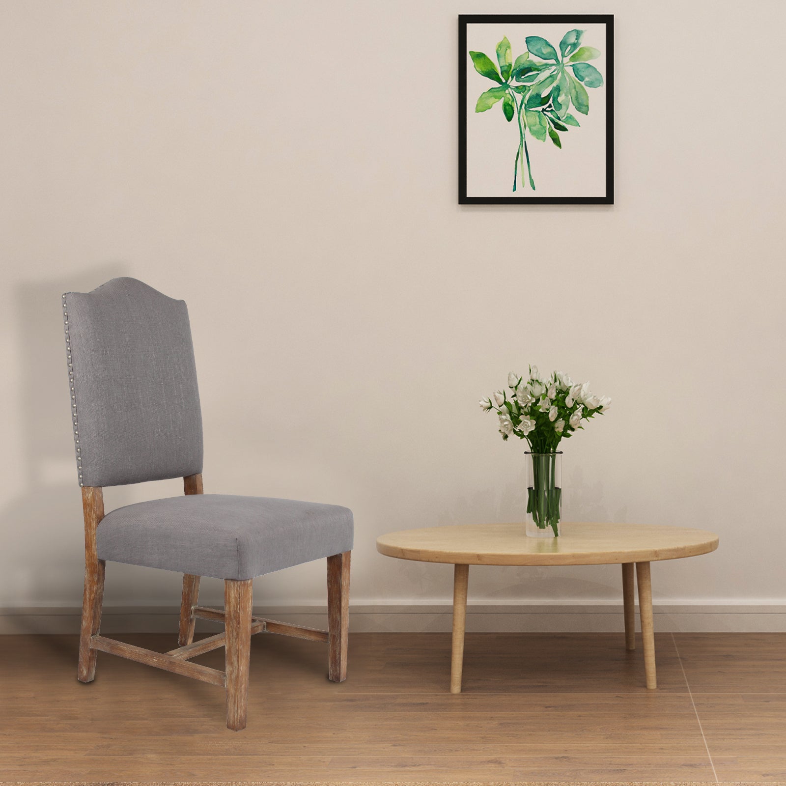 - ELEGANT STYLE: Stunning finishes of a white distressed, exposed wood leg and textured linen upholstery.