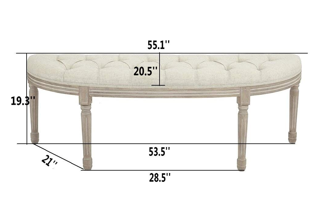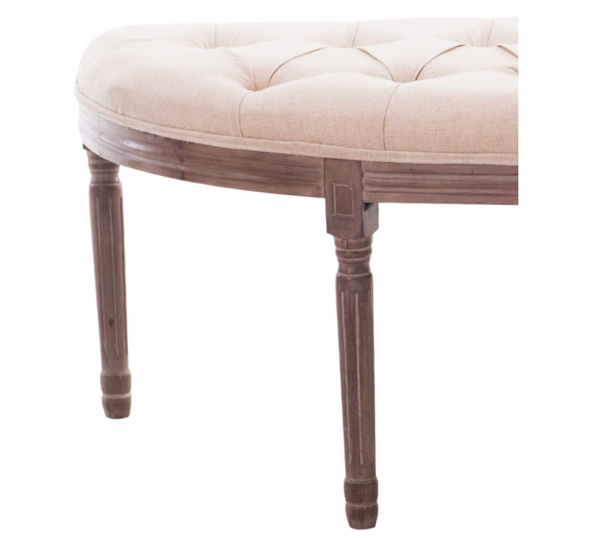 Cui Liu Hampton Natural Linen Hand Tufted Bench with Natural Reclaimed Carved Wood Legs French Antique Inspired Farm House End of Bed Entry Way Bench
